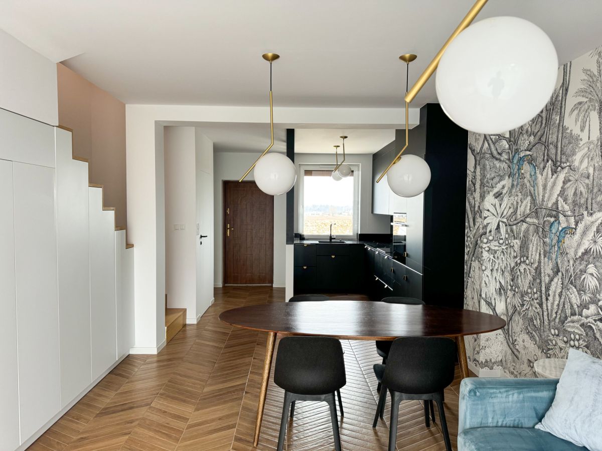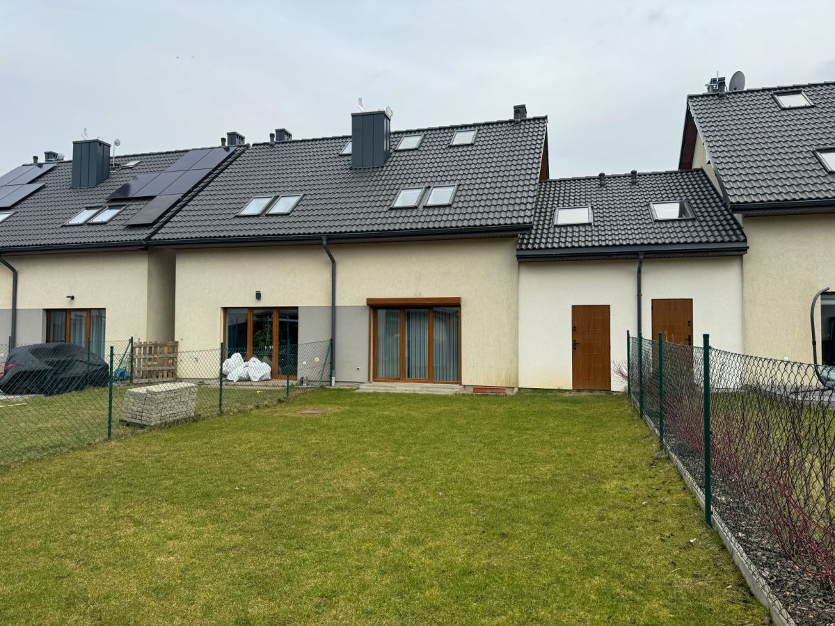Kuchnia w zabudowie (blat - granit) ze sprzętem AGD (lodówka, piekarnik na "słupku",płyta indukcyjna, zmywarka). W łazience prysznic a na wyposażeniu pralkosuszarka. W sypialniach łóżka, które mogą być podwójne (małżeńskie) lub po złożeniu pojedyncze. W salonie na wyposażeniu kanapa, stolik kawowy, stół z 4 krzesłami, TV, komoda. Zabudowana przestrzeń po schodami - miejsce do przechowywania. Ozdobny, panelowy kaloryfer w salonie oraz w przedpokoju. Szambo. Piec gazowy dwufunkcyjny. Oświetlone, drewniane schody. Na podłodze na piętrze oraz poddaszu podłoga drewniana, na parterze kafle. Średnio miesięczne opłaty ok 600 zł (woda, prąd, gaz, śmieci) + wywóz szamba. Dom jest w bardzo dobrym stanie - do wykończenia użyto materiałów wyższej jakości. Dobudowany garaż z bramą na pilota. Warunki najmu: czynsz dla właściciela 4800 zł + opłaty eksploatacyjne wg zużycia. Wymagana kaucja. Najem długoterminowy. Na osiedlu zainstalowany internet - światłowód.
