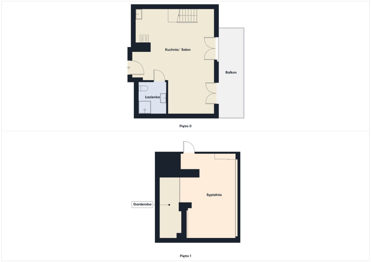 - II poziom: duża sypialnia z oddzielną garderobą, zapewniająca prywatność i dużo miejsca do przechowywania